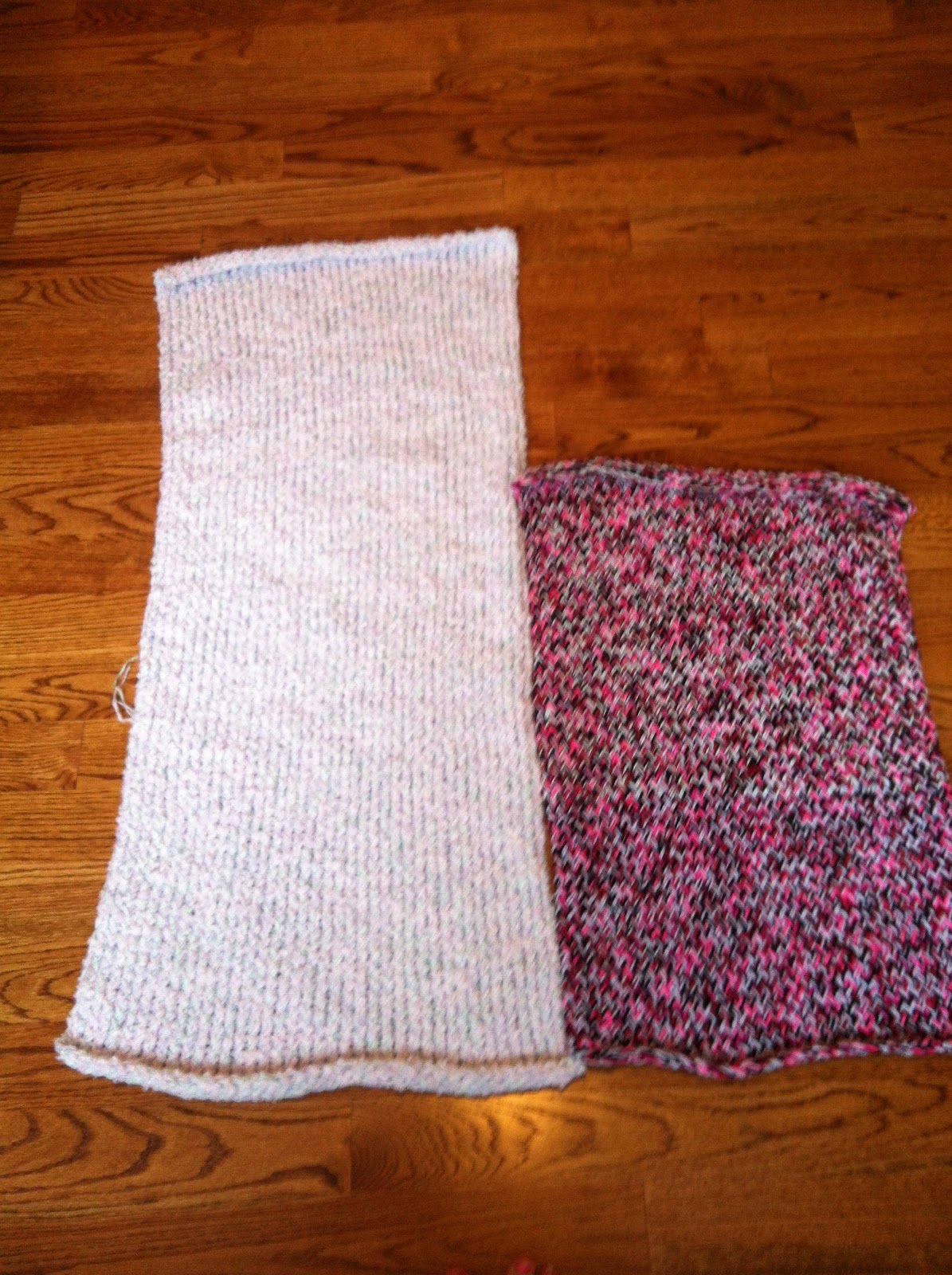 I used the extra large yellow round loom from Provo Craft and made flat panels. I had a few skeins of yarn that I had gotten for projects that I never got to and can no longer remember what I was going to make. Currently I have two good sized panels and have sew them together; side by side. While not the same size they were making me sweat while I made them. One is with 3 strands of yarn, the other with 4. Both the same thickness. I have a few pictures and am still trying to figure out how to upload them. I may add them to the next update if I can figure it out.